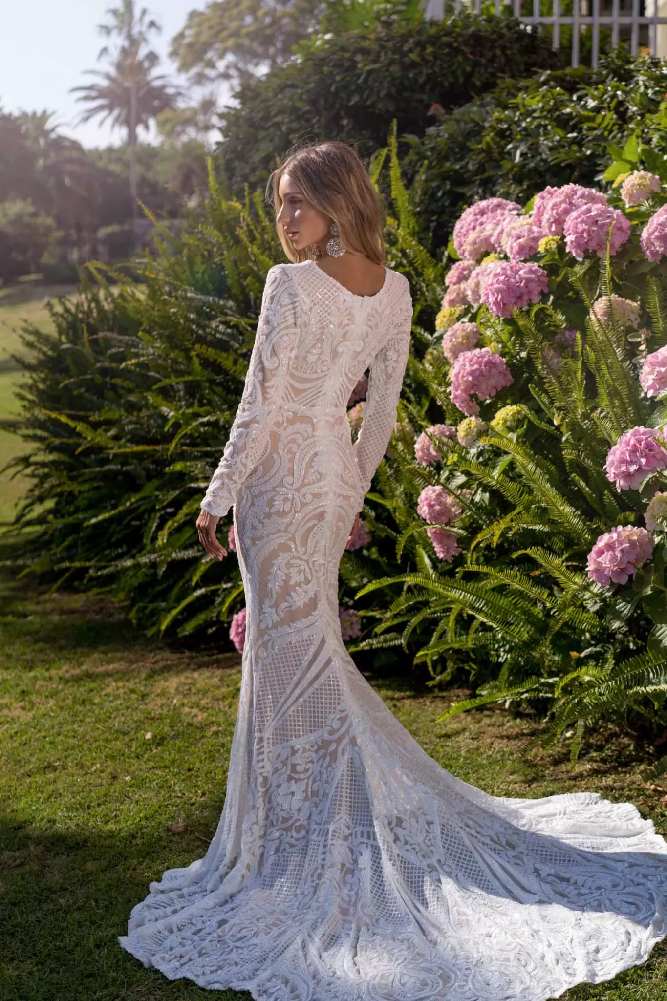 Women NBLUXE Dresses | Black Tie Dresses>Elena Long-Sleeve Pattern Sequin Gown – White/Nude
