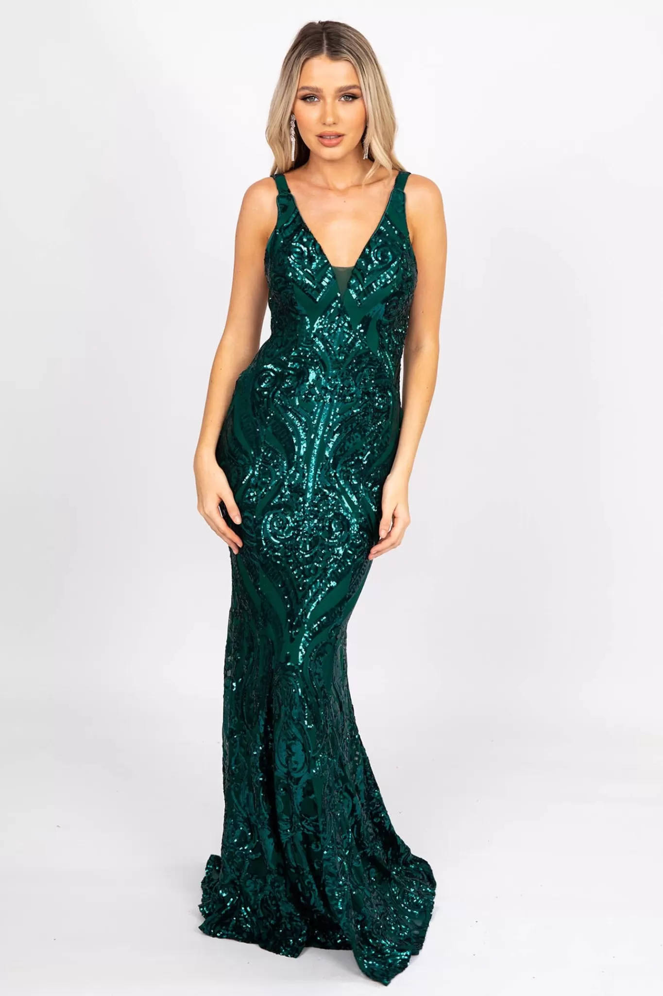 The Seraphine evening gown features embroidered sequins, V plunge neck and an open back design. This fitted evening gown is the perfect head turning piece for your next special event.