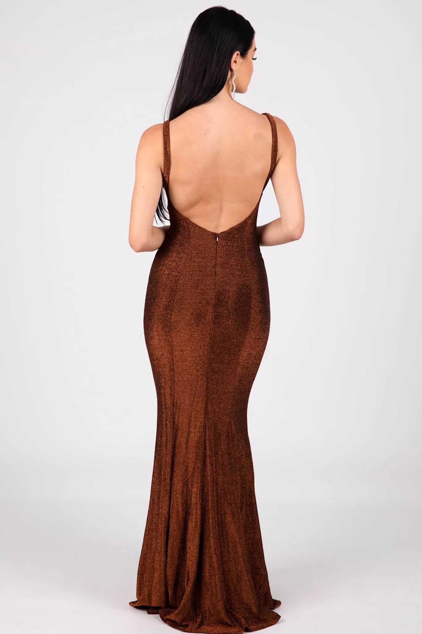 Thalia features classic V plunge neck and open back design. This fitted evening gown is the perfect head turning piece for your next special event.