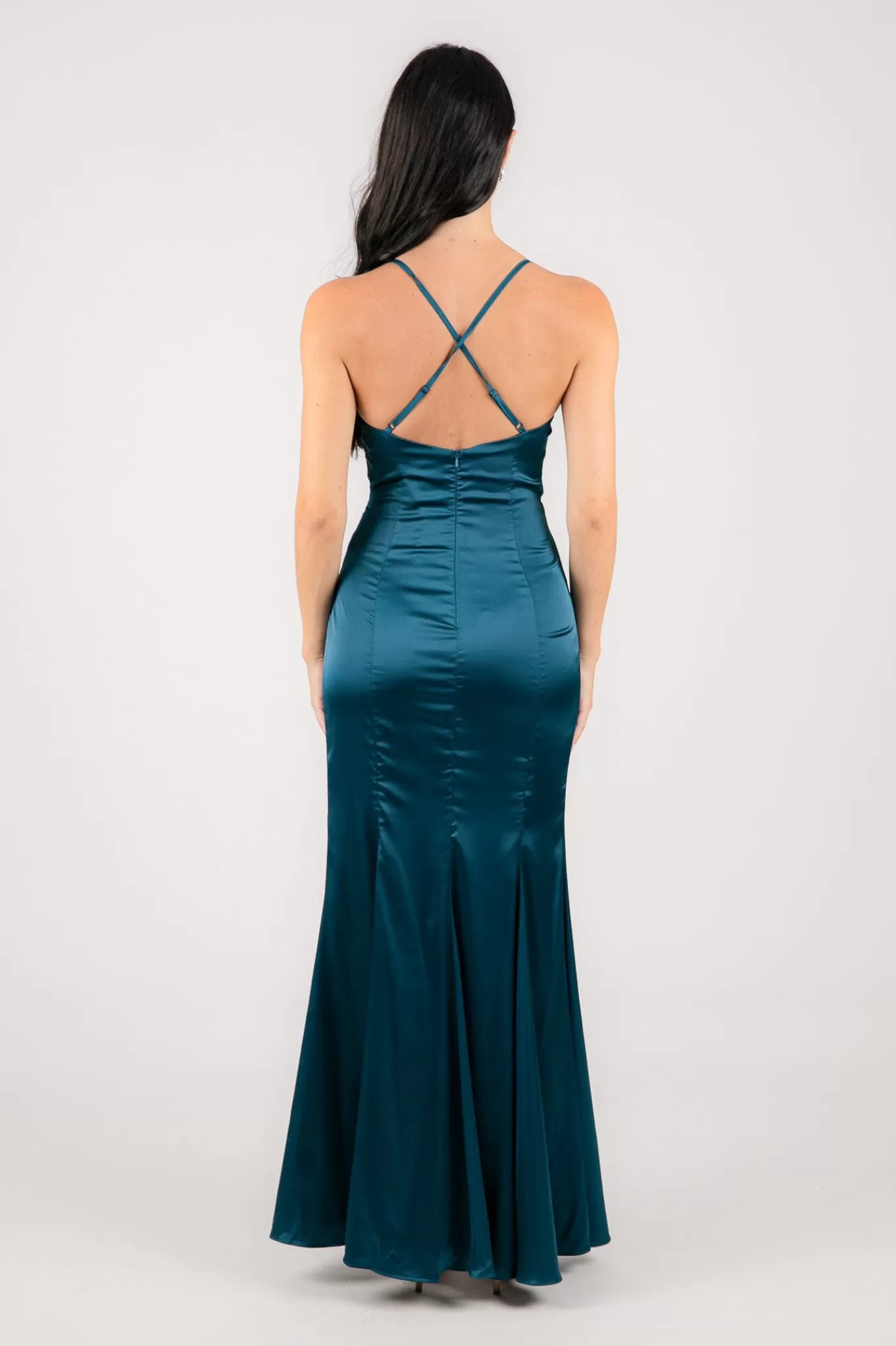 The lovely BELINDA features V neckline, gathered waist and thigh-high slit. This gorgeous satin formal dress is perfect for rustic themed bridesmaids, wedding guests, black tie and other special occasions.