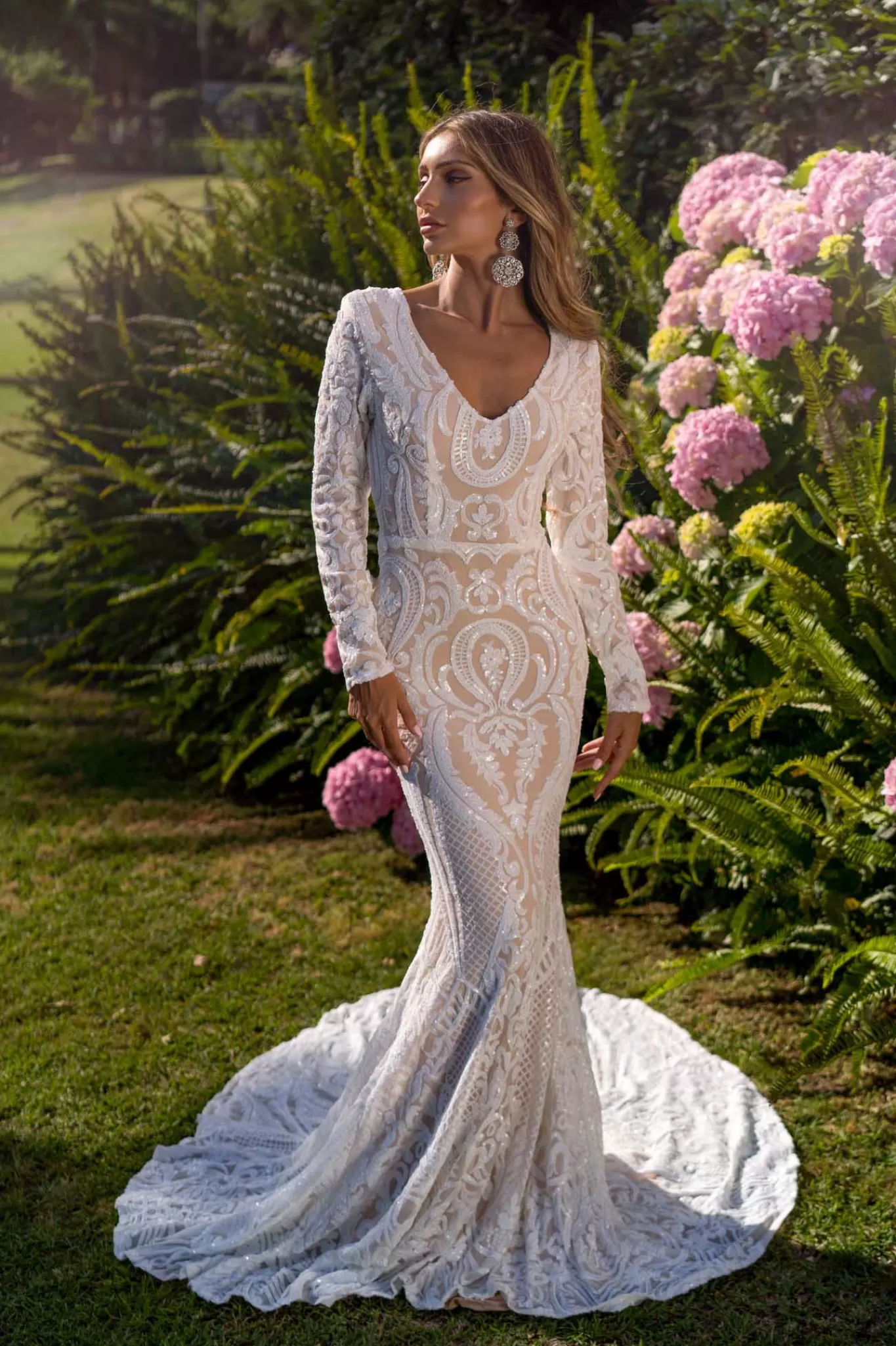 Elena features the trendy nude illusion look with its white embroidered pattern sequins over nude underlay. The classic V neckline, figure-hugging long-sleeve bodice that flows into a mermaid sweep train create striking silhouette. This dress will make you look and feel beautiful on your wedding day or formal event.