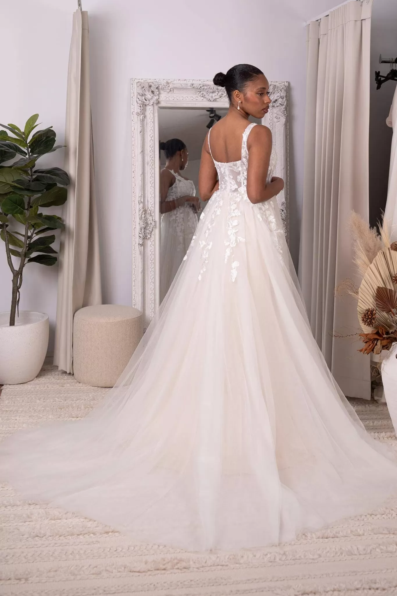ROSA is a sweet A-line wedding gown with a modern flair. Featuring square neckline, floral and vine-like lace motifs embellished on layered tulle. The exposed-bone bodice adds a trendy and sexy touch, finished with an airy A-line skirt and a flowing train, this romantic gown is a dream for the modern bride.