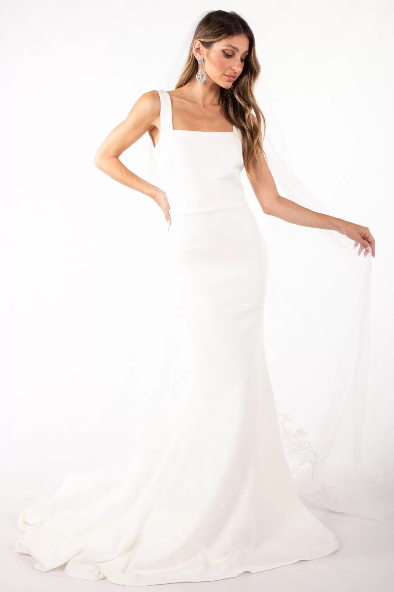 The ASTER Cathedral Lace Veil is handmade from sheer, lightweight tulle with stunning lace appliques and attached to a plain metal comb. This stunning long lace veil will add the perfect finishing touches to your bridal look. Pair perfectly with one of our Lace Wedding Dresses.