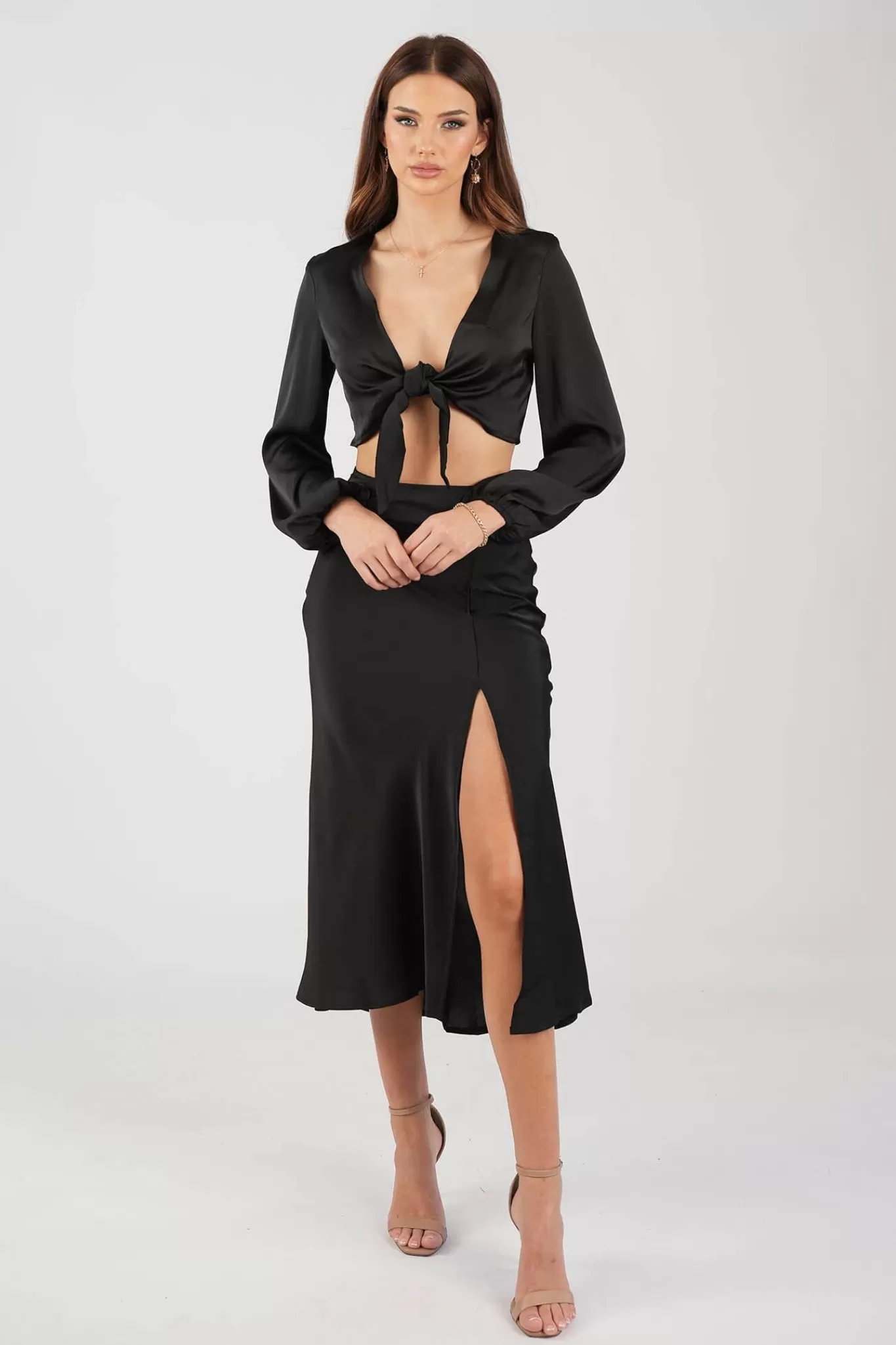 Sleek and chic, the gorgeous Quinn set is cut from lustrous satin-like material and featuring a long sleeve V-neck front tie crop top and a midi skirt with a thigh high slit. Style this stunning two-piece set with some gold accessories and either heels or sandals to complete the look.